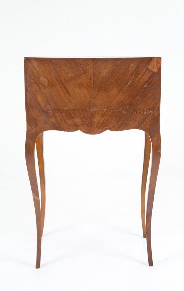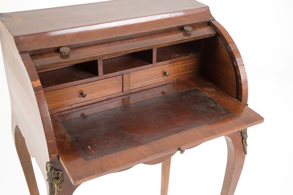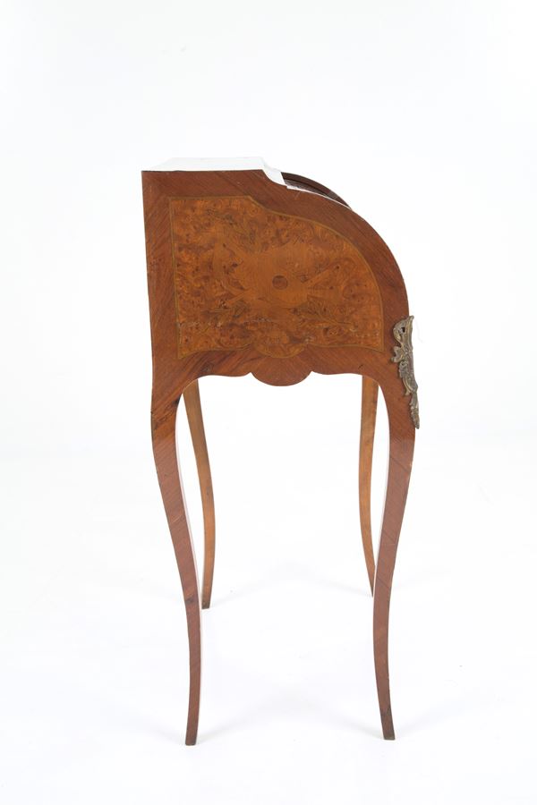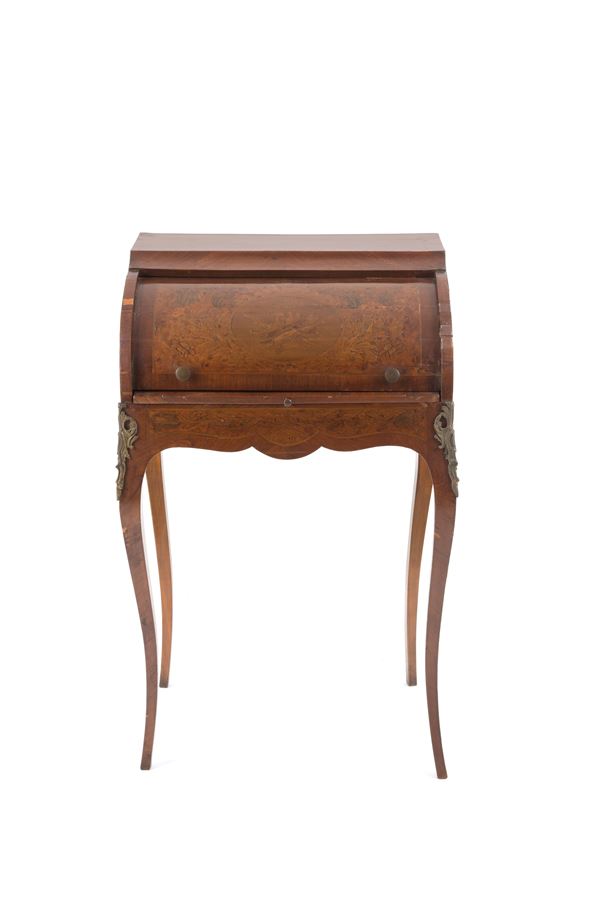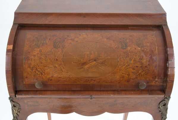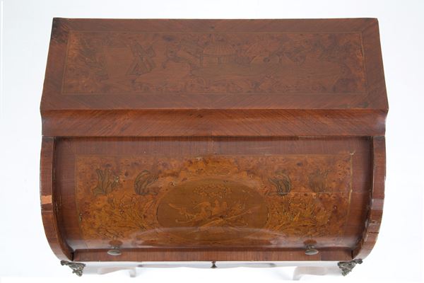 Roller desk in veneered wood inlaid with floral motifs, birds and allegories of the arts. Early 20th century. Defects.
