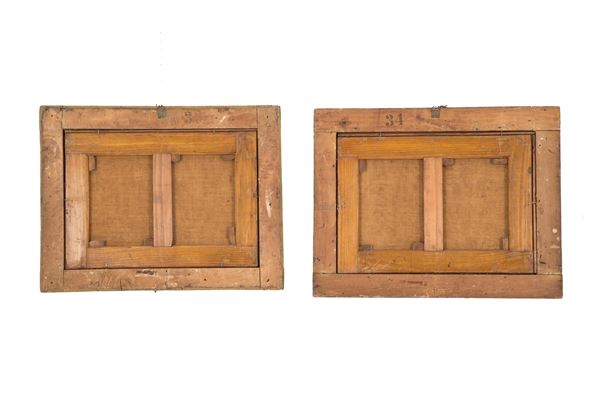 Pair of oil paintings on canvas depicting "SHEPHERD WITH HERMS AND DOG" and "HERDS". In contemporary frames in finely carved and gilded wood. Already relined and reframed.