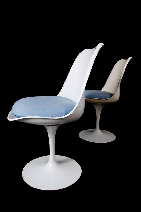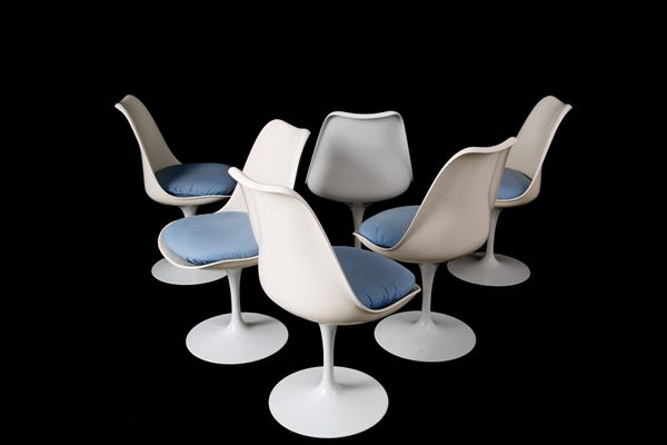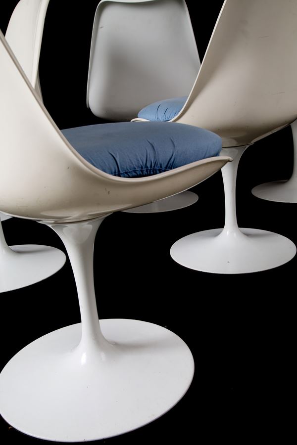 Six TULIP model chairs in white plastic material and white painted metal support. Defects and signs of wear and tear.