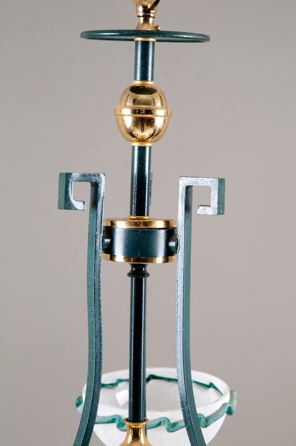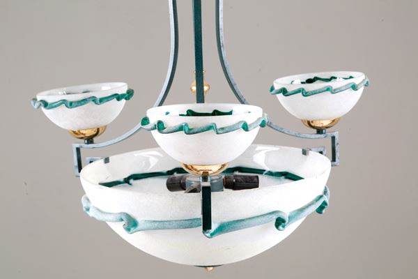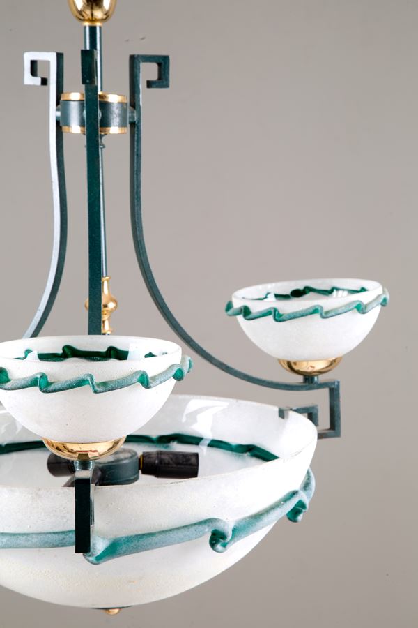 Six-light chandelier with four sandblasted glass cups, green painted metal and brass structure. 80s.