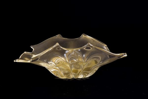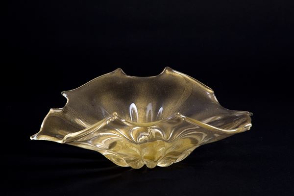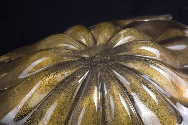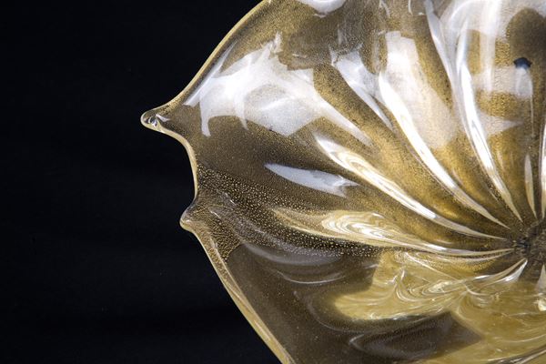 Irregular shaped glass leaf centerpiece with submerged gold leaf. Signed on the bottom. With 'Archimede Seguso label, Murano'.