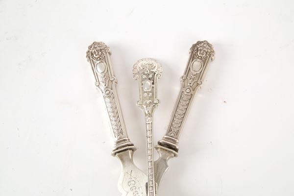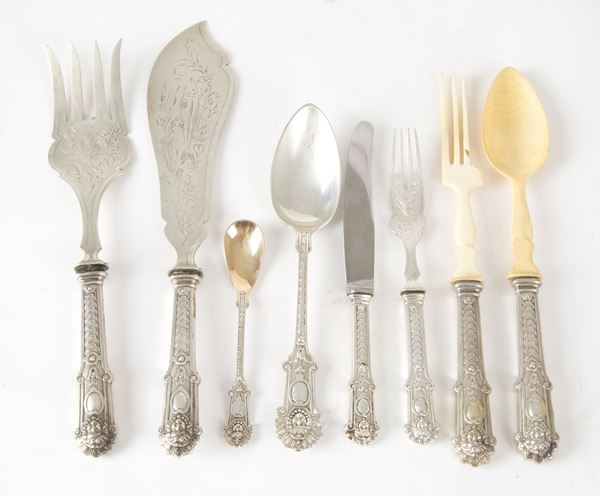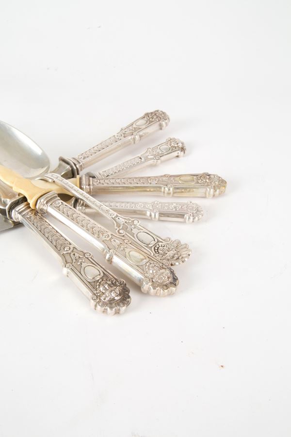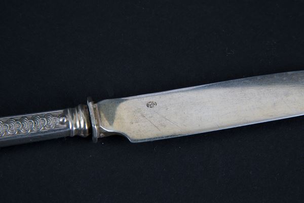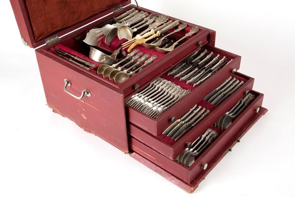 Silver cutlery set, gr. 6,500 approx. total (cutlery and knives not entirely in silver excluded). German manufacturing. In multi-drawer box. 20th century. Missing a knife.