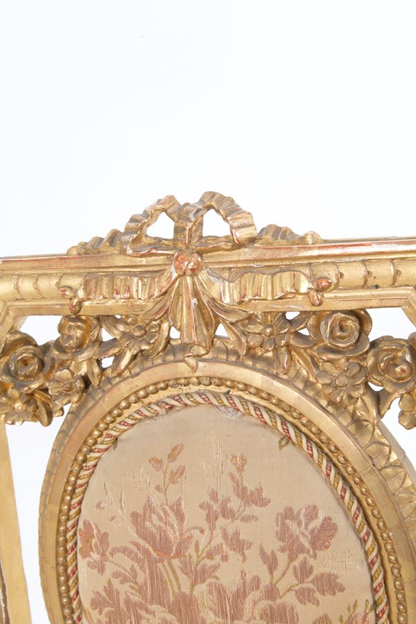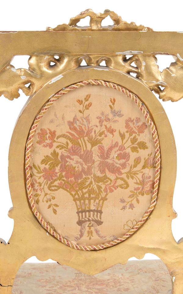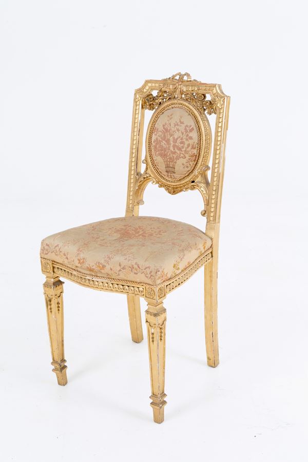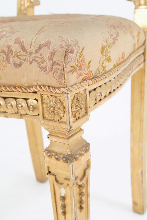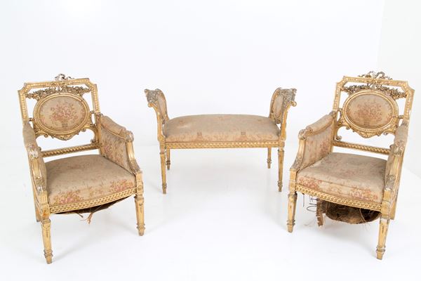 Six chairs, two armchairs and a bench in finely carved and gilded wood with padded back and seat covered in silk. Production SOLEI HEBERT & C., NAPLES. Late 19th century. Defects and shortcomings.