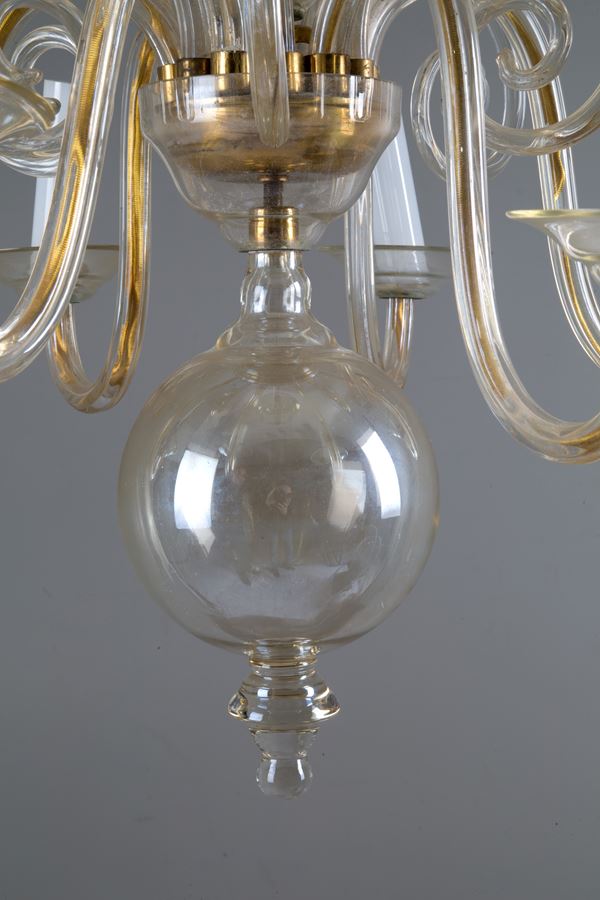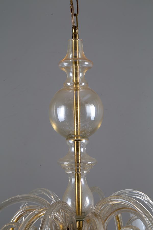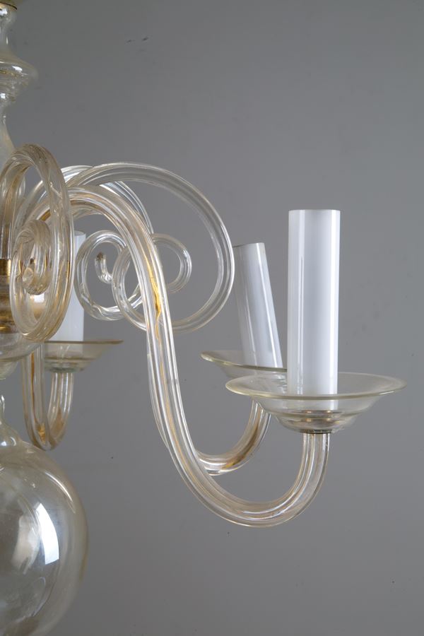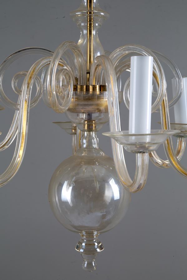 Six-light amber glass chandelier. 20th century. Defects.