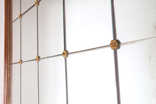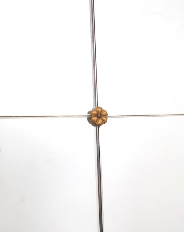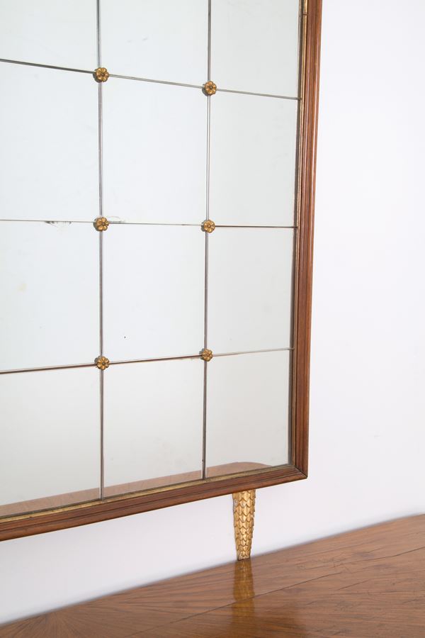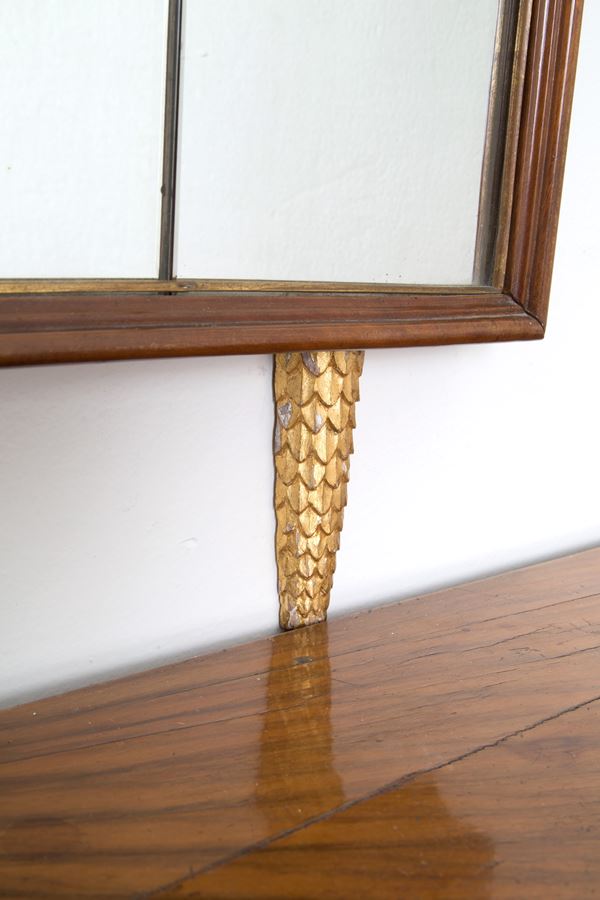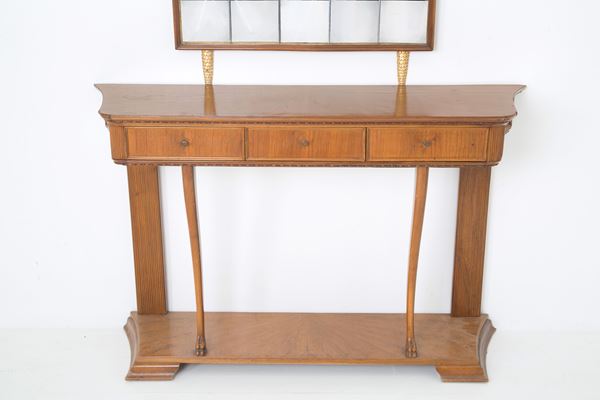 Small console in walnut and briar wood with three drawers on the band and mirror with square glasses joined by golden studs. Production MOBILIFICIO F.LLI SCREMIN. With manufacturer's label. Signs of wear and tear over time.