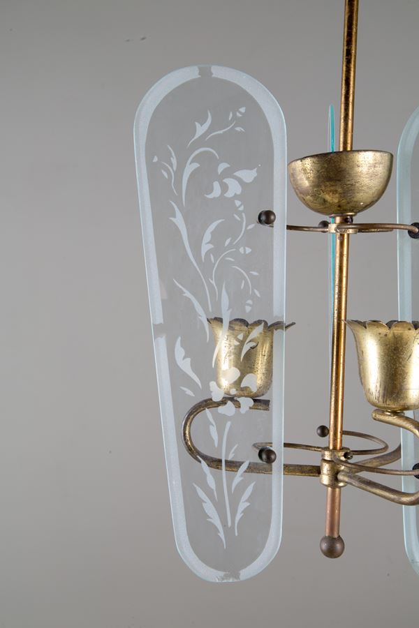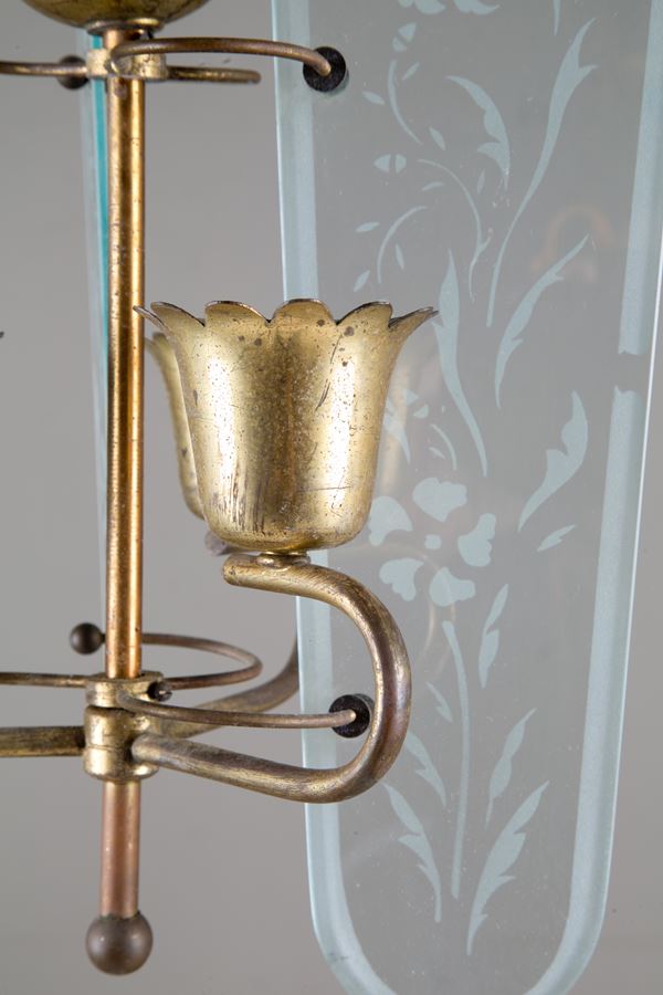 Three-light brass chandelier with acid-etched glass. 60's. Signes of wear and tear over time.