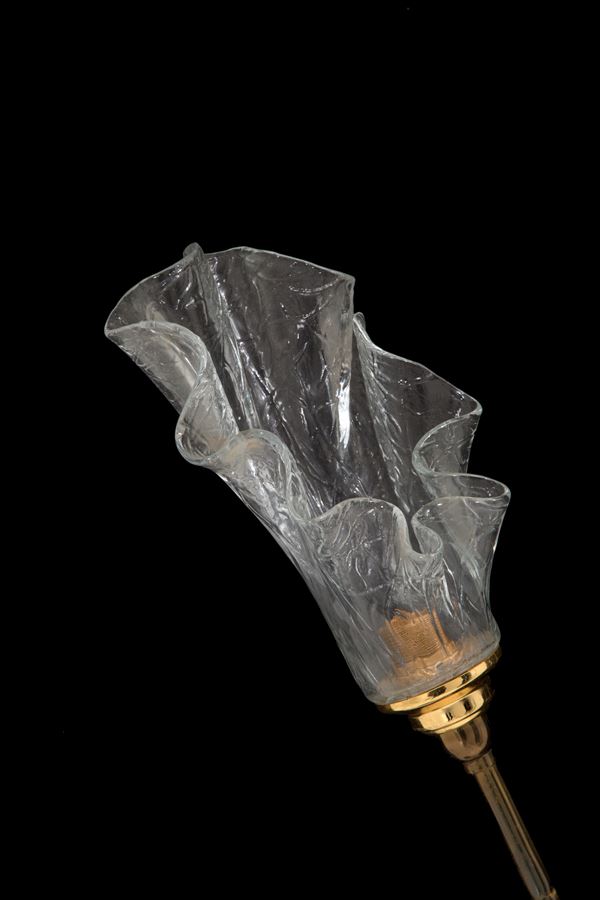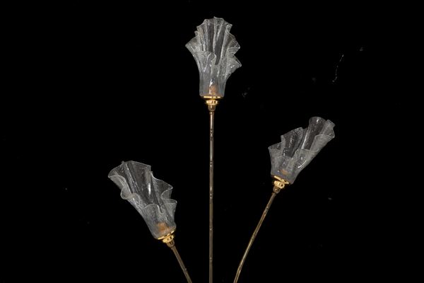 Three-stem floor lamp in golden brass with three glass lampshades. 70's. Signs of wear and tear over time.
