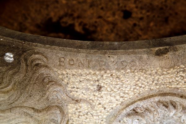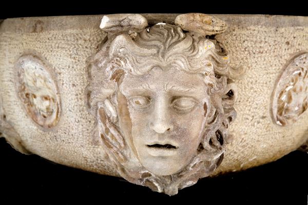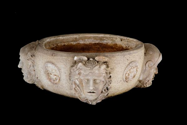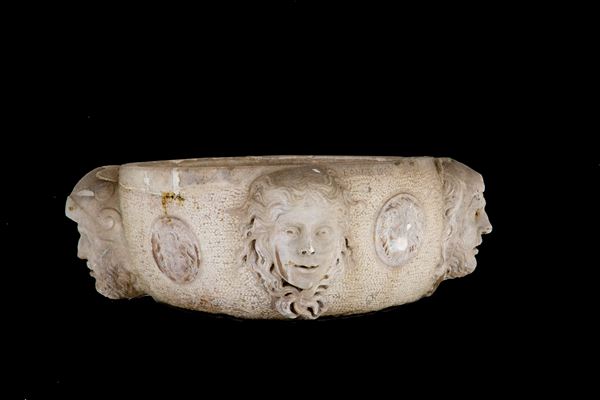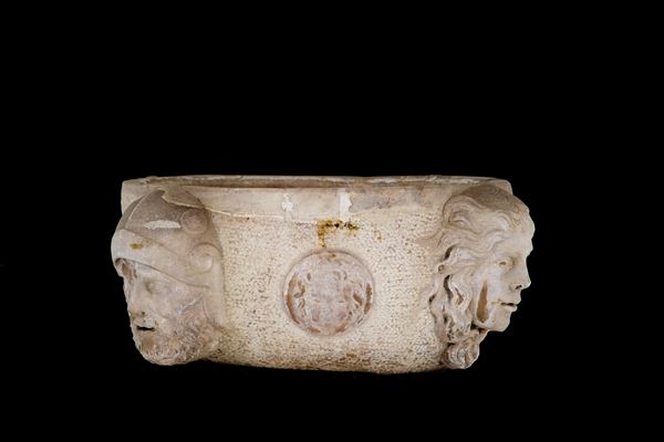 Statuary white marble basin with four heads and four medallions. Signed BONI P. and dated 1982.