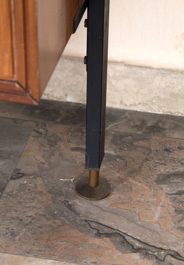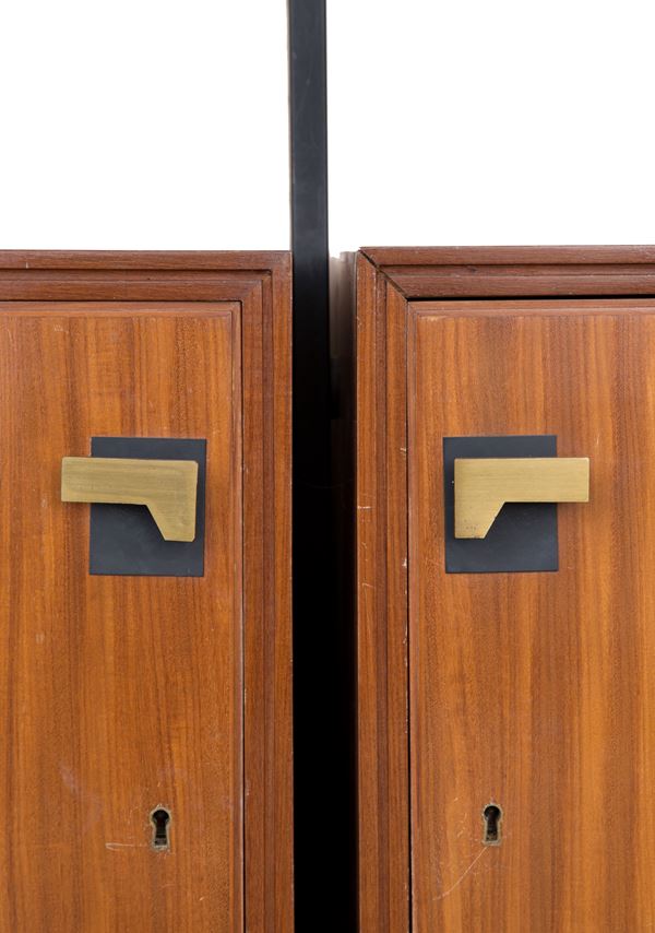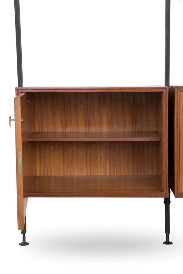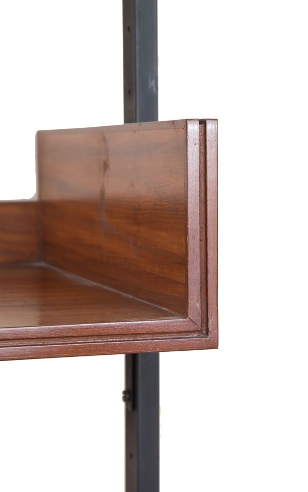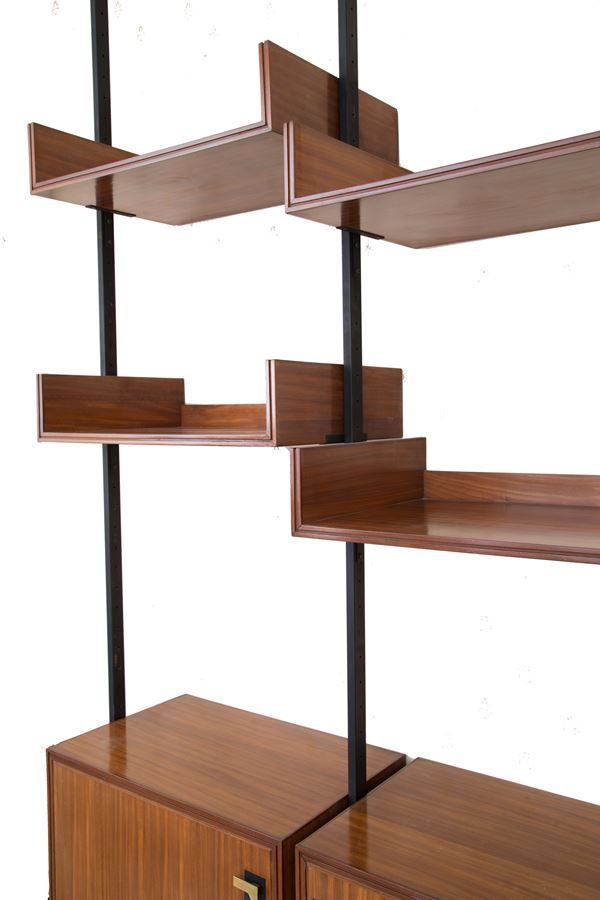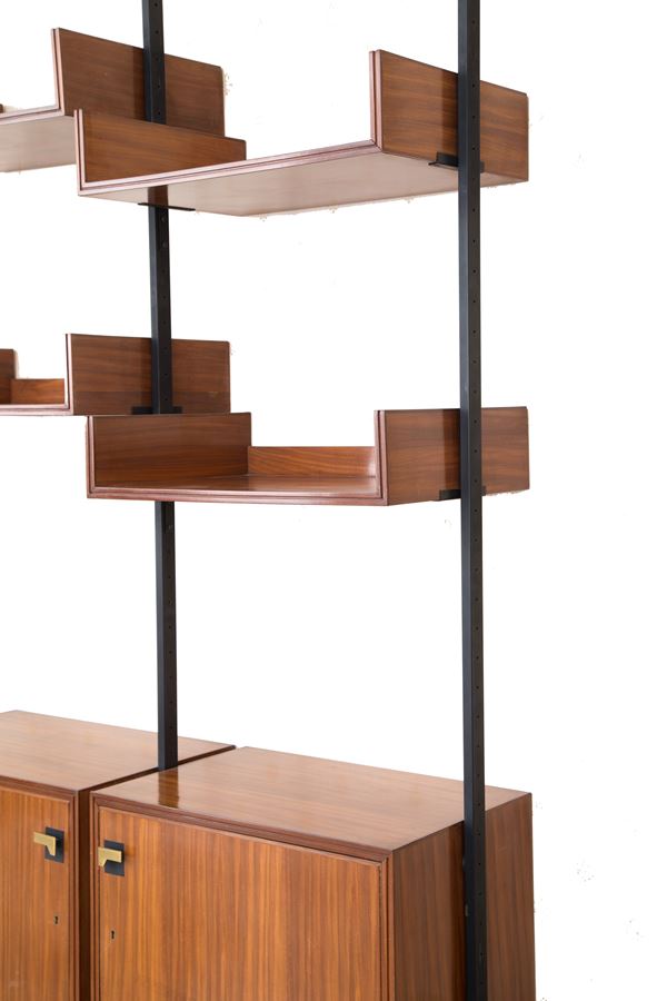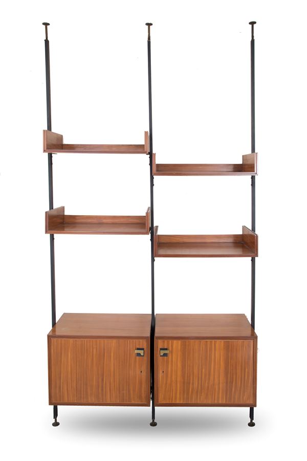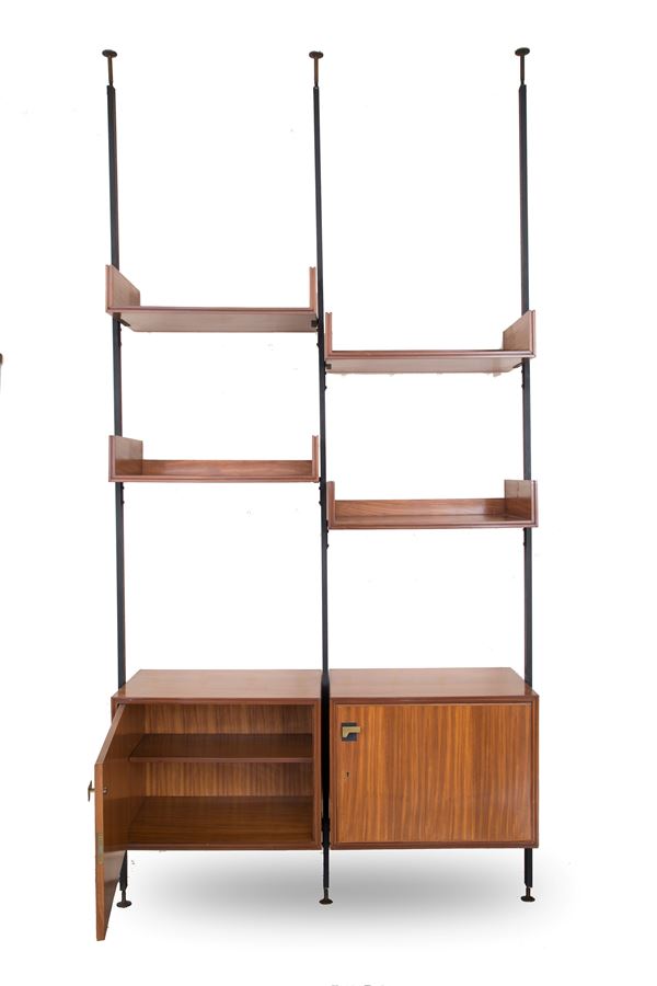Two-element bookcase in oak wood and black lacquered iron with modular elements and wooden shelves available to your taste and brass feet and handles. 70's. Minor defects and signs of wear and tear over time.