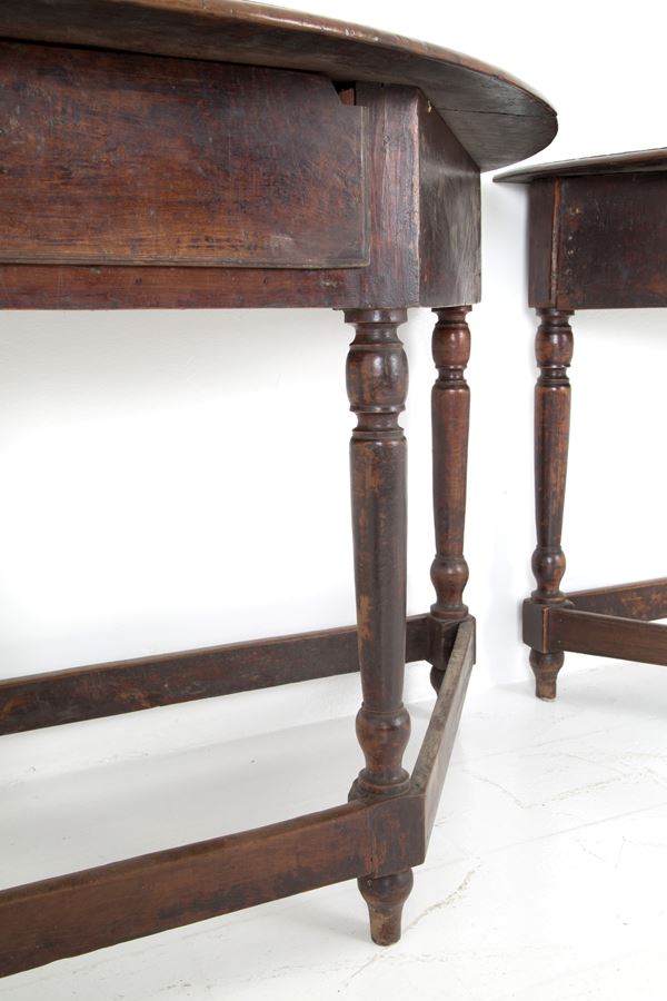 Two half-moon consoles in walnut wood with spool-turned legs. 17th century.