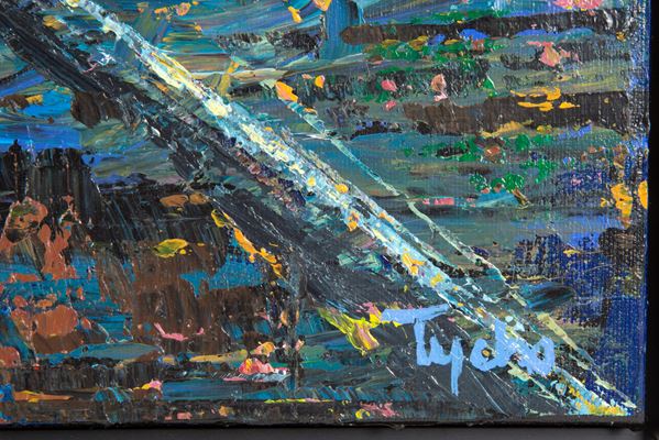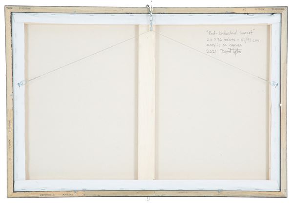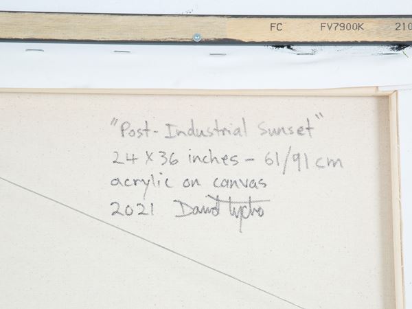 Acrylic on canvas titled "POST-INDUSTRIAL SUNSET". Signed lower right. Countersigned, titled and dated 2021 on the back. In frame.