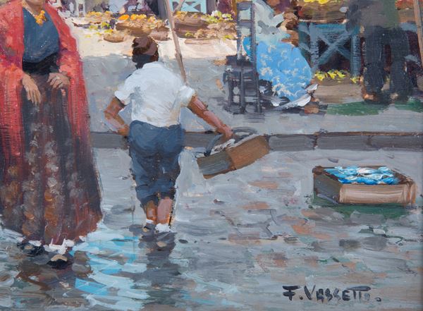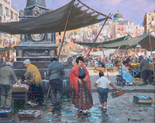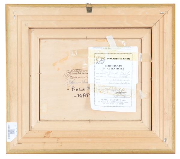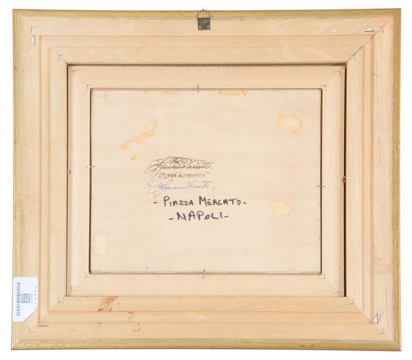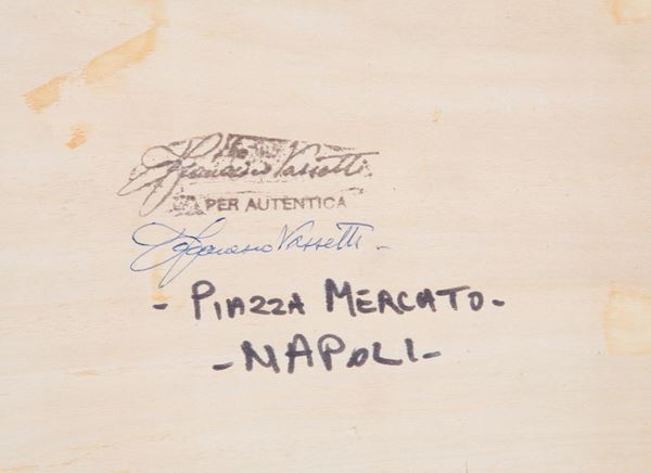 Oil painting on panel entitled "PIAZZA MERCATO, NAPOLI". Signed lower right. With stamp, signature for authentication and title on the back. In frame.