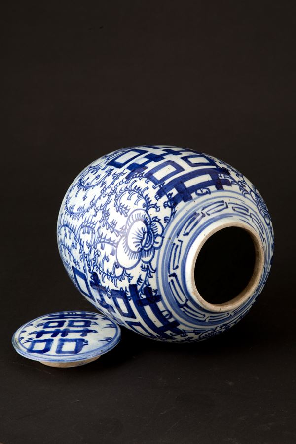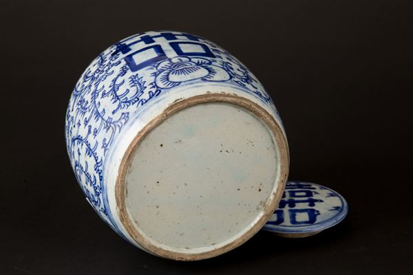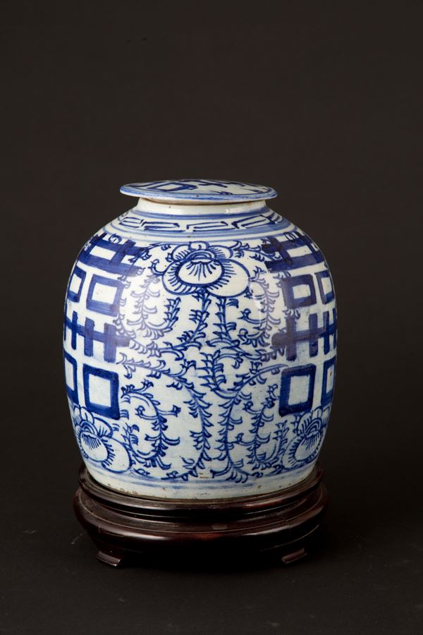 Rice vase in white and blue porcelain. Wooden base. China. Late 19th century. Defects.