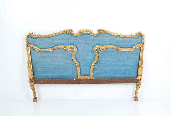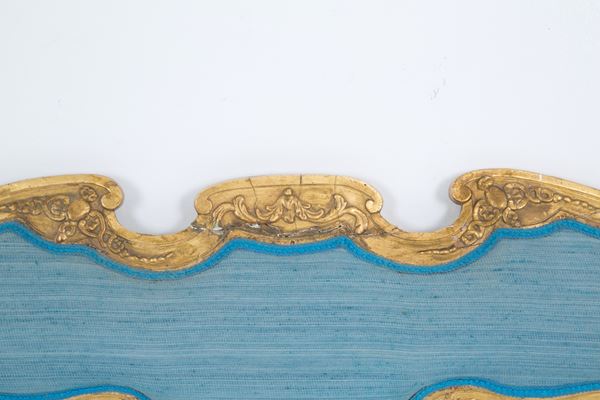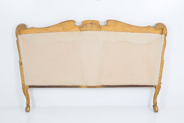 Carved and gilded wooden bed with padded headboard. 18th century. Flaws and shortcomings of the laterals.