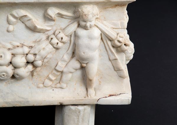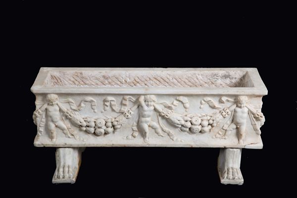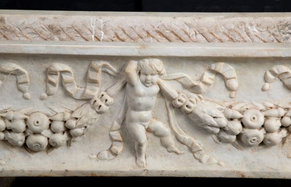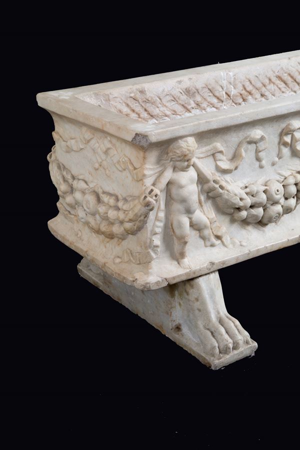 Ancient tub in statuary white marble carved with a garland and putti. Defects.