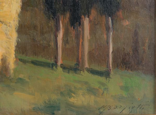 Oil painting on plywood entitled "CYPRESSES AND PAGLIAYS". Signed lower right. Countersigned, titled and dated 'Montepulciano, August 1970' on the back. In frame.