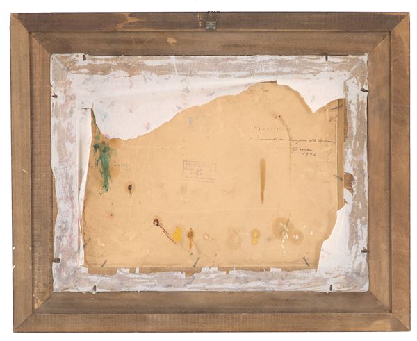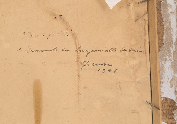 Oil painting on cardboard entitled "SUNSET ON THE LUNGARNI ALLE CASCINE". Signed and dated 1945 lower right. Titled and countersigned on the back. In frame.