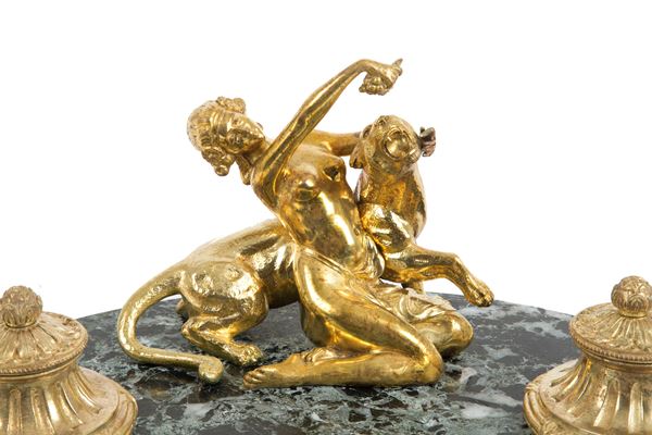Gilded bronze inkwell with marble base decorated with a female figure and a lion. 19th century. Slight defects.