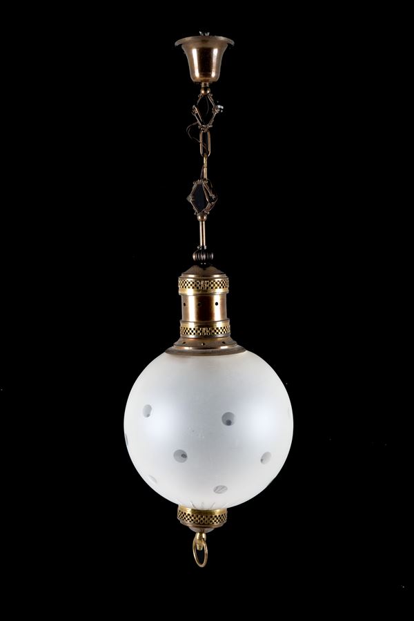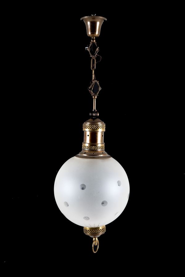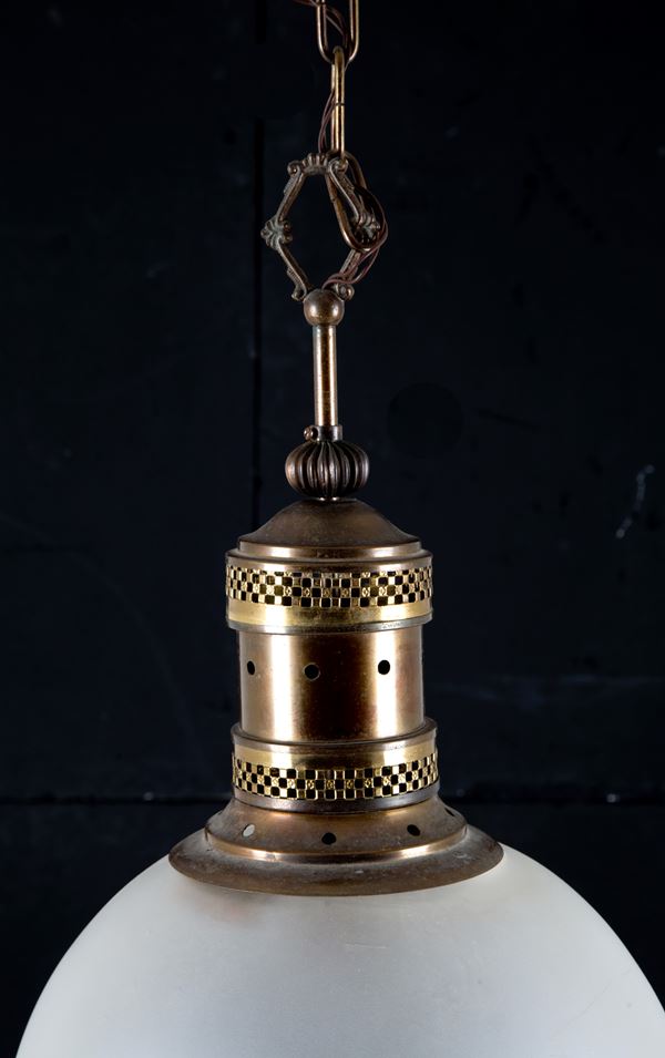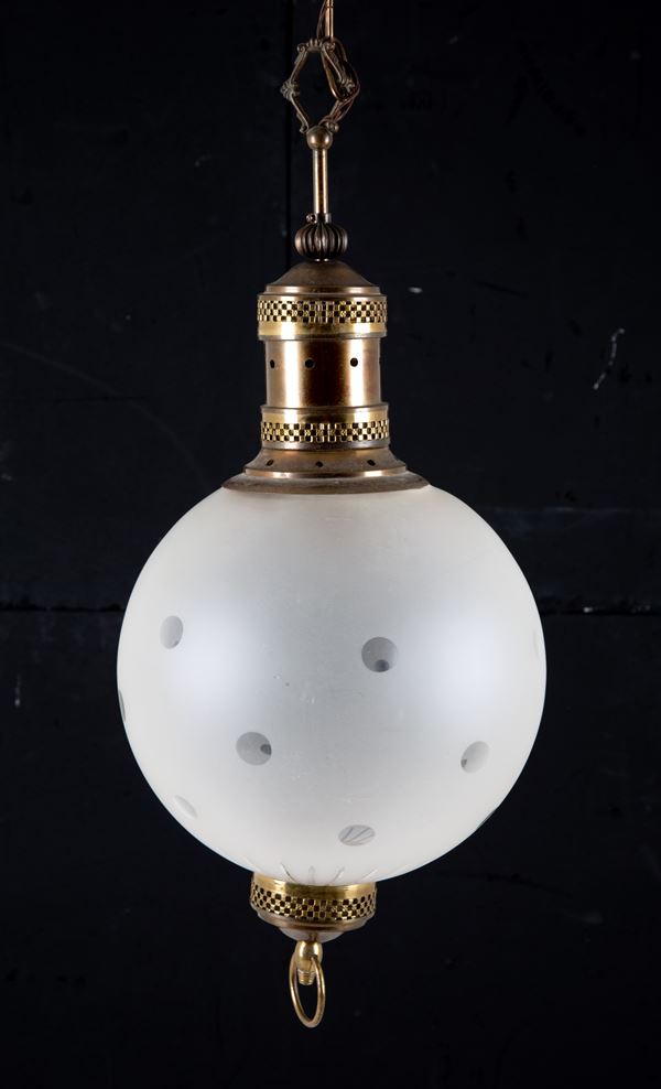 Pair of brass chandeliers with spherical satin glass diffusers with small spheres. AZUCENA production. 60's.