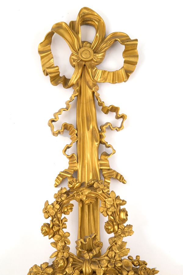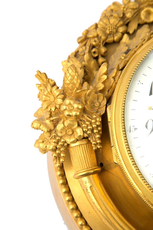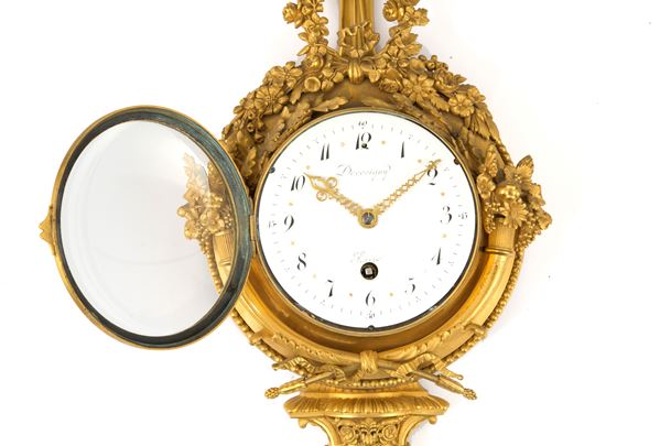 Cartel wall clock in finely chiseled and gilded bronze with enamel dial. Marked DECOVIGNY, Paris. Early 19th century. To be revised.