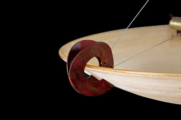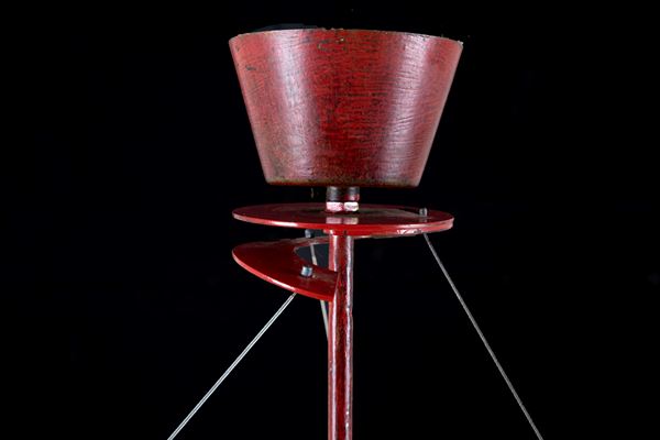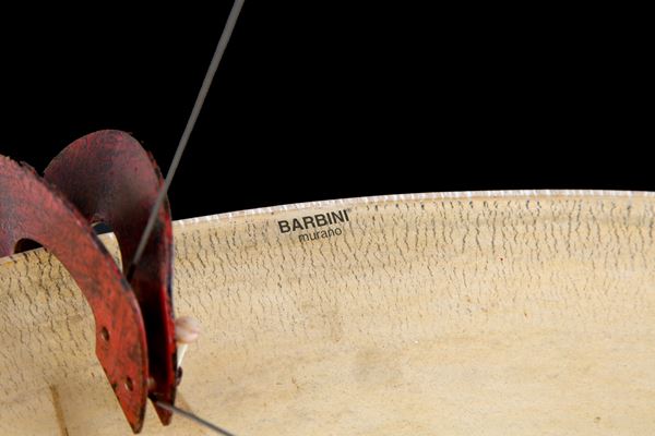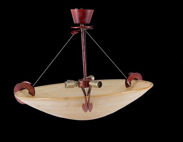 Three-light chandelier composed of a large cup in iridescent glass paste with a hollowed-out effect and red painted metal. BARBINI production, Murano. With manufacturer's label inside.