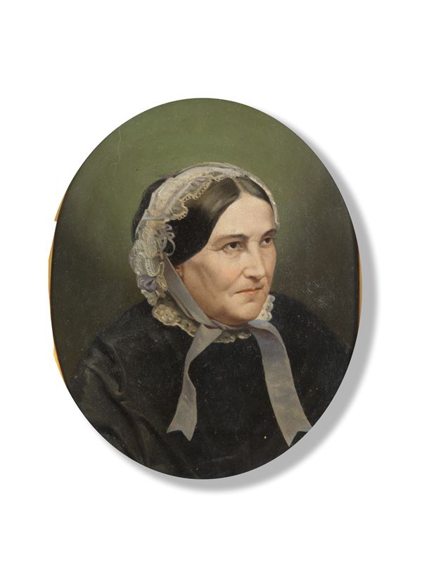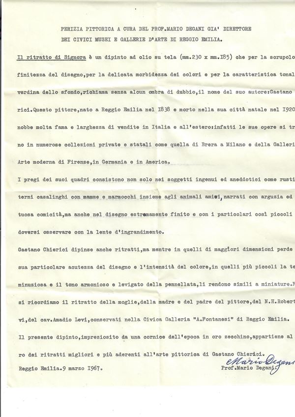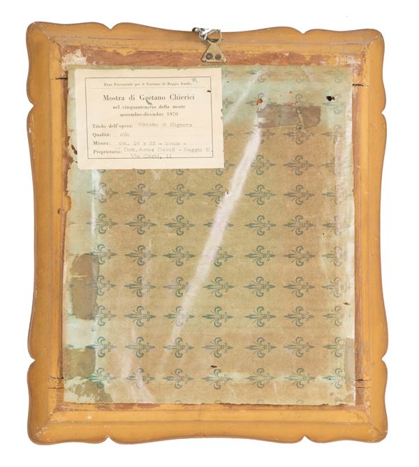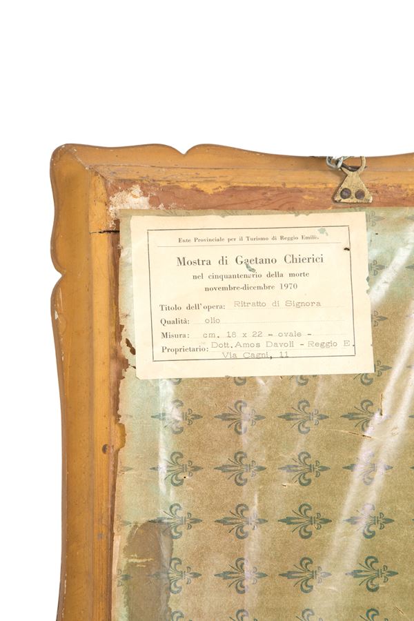 Oval oil painting on canvas depicting "PORTRAIT OF A LADY". In a golden frame. With scroll from the exhibition of Gaetano Chierici on the fiftieth anniversary of his death, November-December 1970 and appraisal by Prof. Mario Degani, former director of the Civic Museums and Art Galleries of Reggio Emilia.