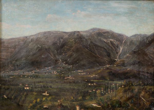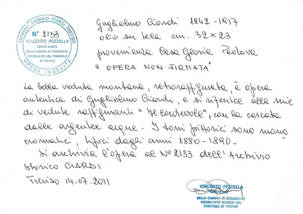 Oil painting on canvas depicting "MOUNTAIN LANDSCAPE, STAIRS OF PRIMOLANO". In ebonized frame. With appraisal from the Ciardi Historical Archive, Treviso and archive number 2133.