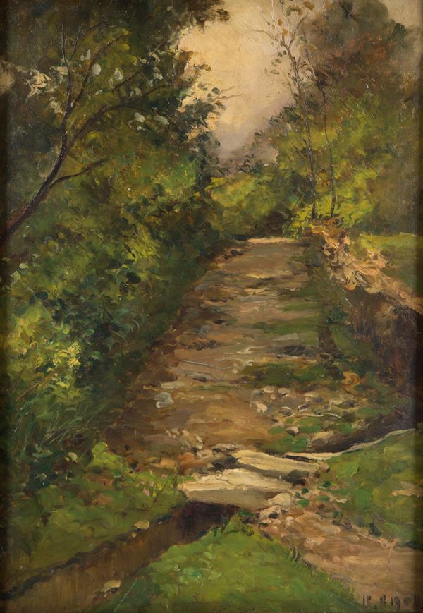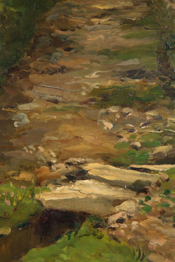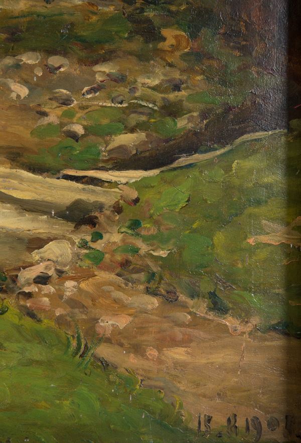 Oil painting on panel depicting "STREAM IN THE FOREST". Dated 11.13.1908 bottom right. In frame.