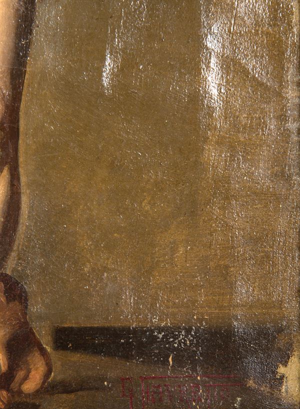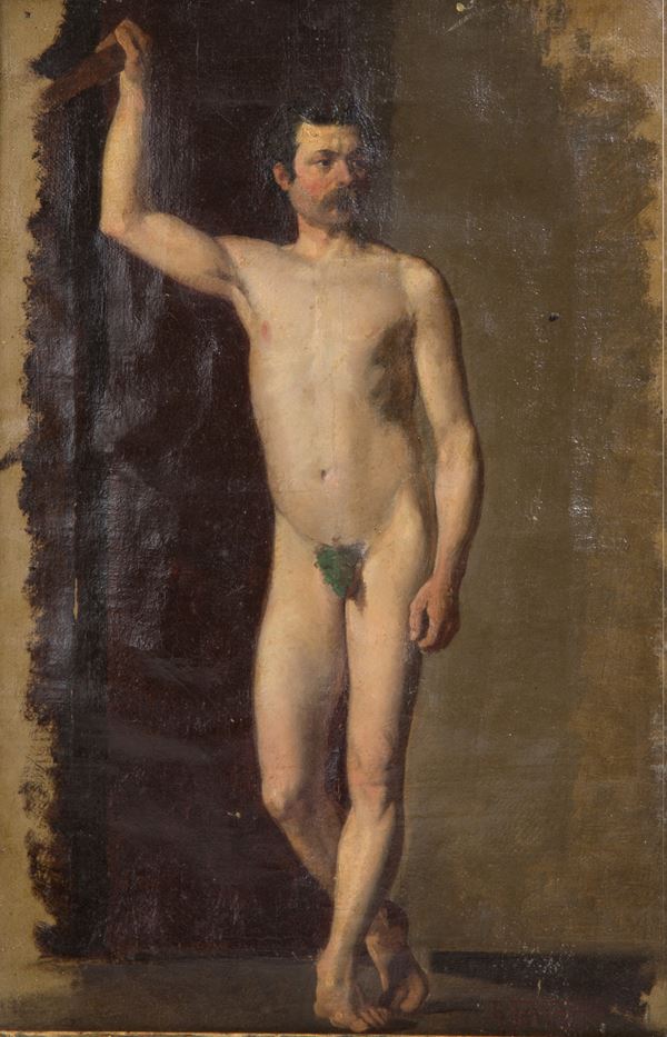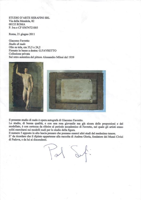 Oil painting on canvas titled "THE ATHLETE". Signed lower right. In a golden frame. Minor defects. With cartouche with confirmation of authenticity signed by Alessandro Milesi in 1939 on the back and certified with photo by Paolo Serafini, Rome, 21 June 2011.