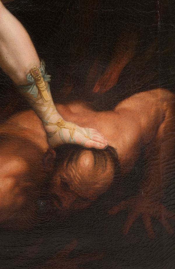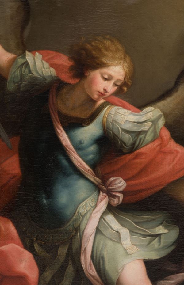 Oil painting on canvas depicting "SAINT MICHAEL THE ARCANGEL". In frame. Defects and restorations.