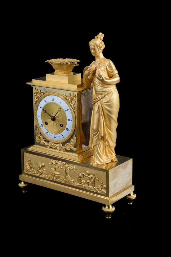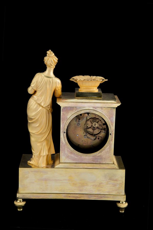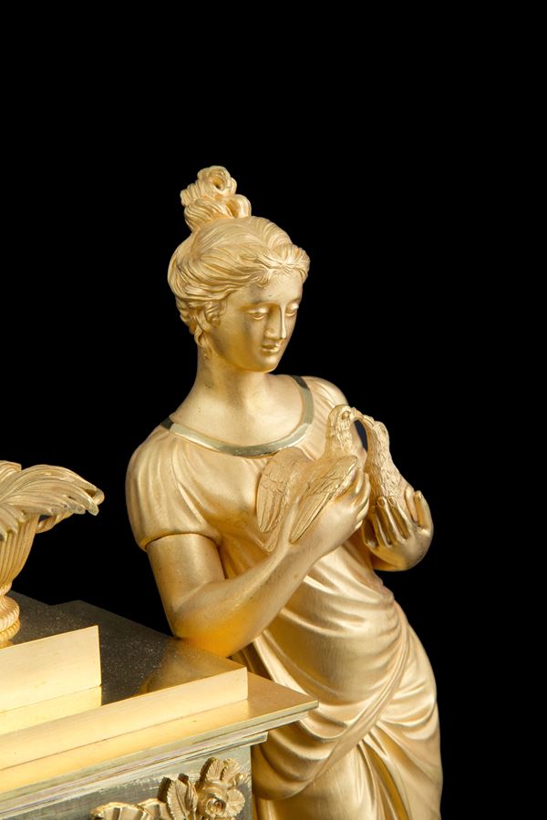 Gilded bronze table clock with female figure holding two doves. France. 19th century.