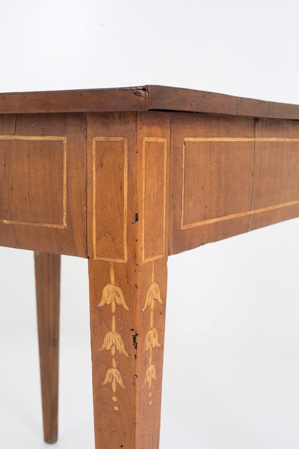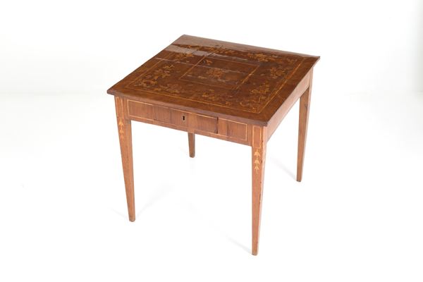 Square coffee table veneered in walnut and inlaid with floral motifs, birds and butterflies. A drawer on the band. Louis XVI period. Defects and shortcomings.