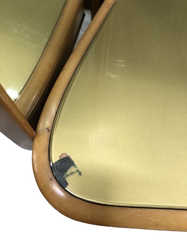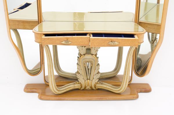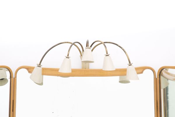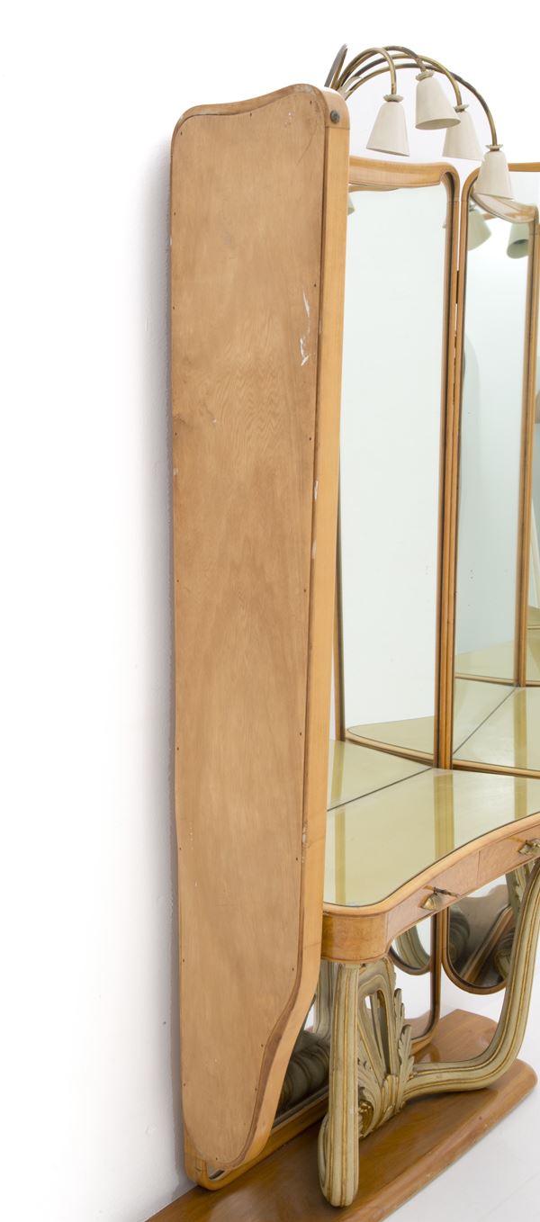 Large mirror with console in blond wood and lacquered and gilded wood with brass handles, two drawers on the band, top in yellow-gold colored glass and five-light lamp in enamelled metal at the top. Italian manufacturing. 40s. Defects and signs of wear over time.