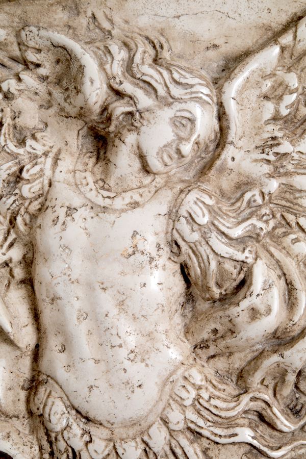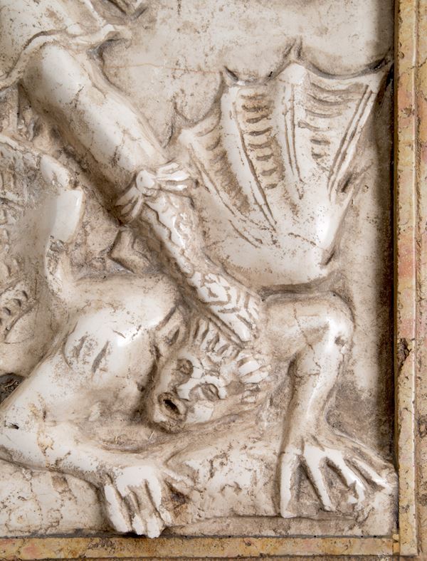 Plaque in Biancone and Giallo Reale marble depicting "SAINT MICHAEL THE ARCHANGEL". 20th century.
