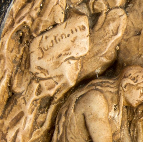 High relief tablet plaque depicting "DEPOSITION". Signed on the left.