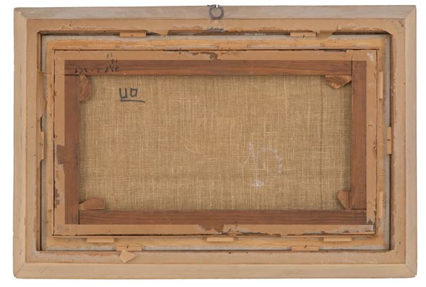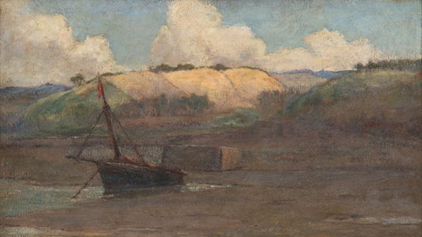 Oil painting on canvas depicting "LAGOON WITH BOAT". 20th century. In frame.