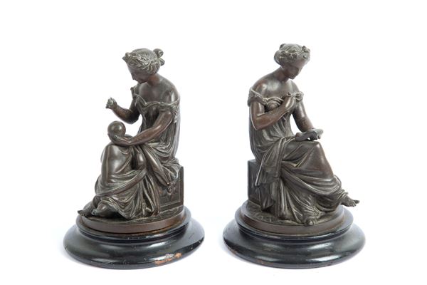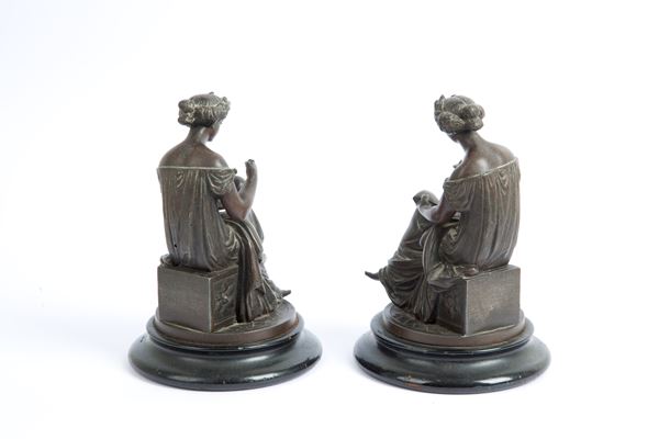 Pair of patinated metal sculptures depicting "SEATED FEMALE FIGURES". Bases in ebonized wood. Late 19th century.