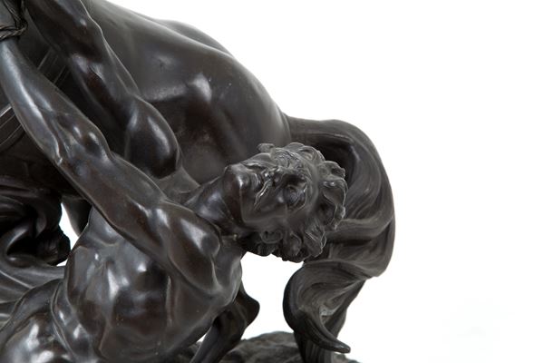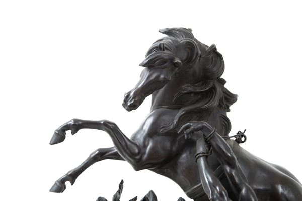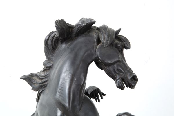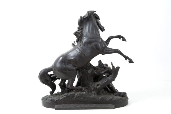 Bronze sculpture depicting "RUNNING HORSE WITH TAMER". Signed on the base.