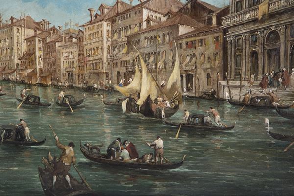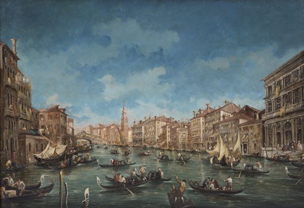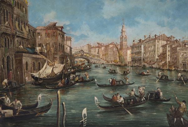 Oil painting on canvas depicting "VIEW OF THE GRAND CANAL TOWARDS THE RIALTO BRIDGE". Signed lower left. In a golden frame. Slight defects.