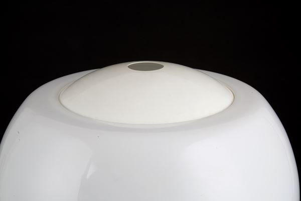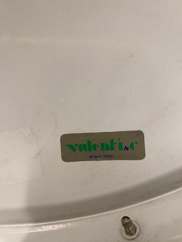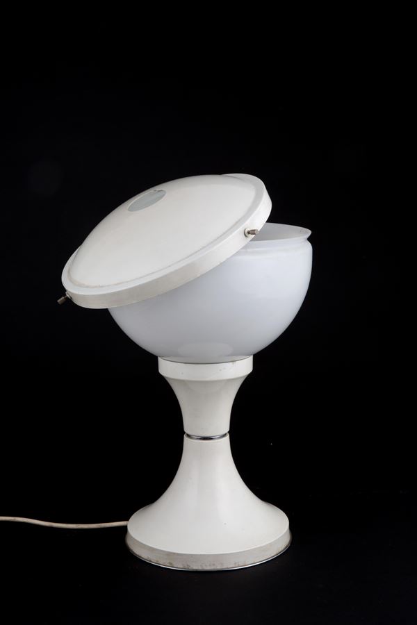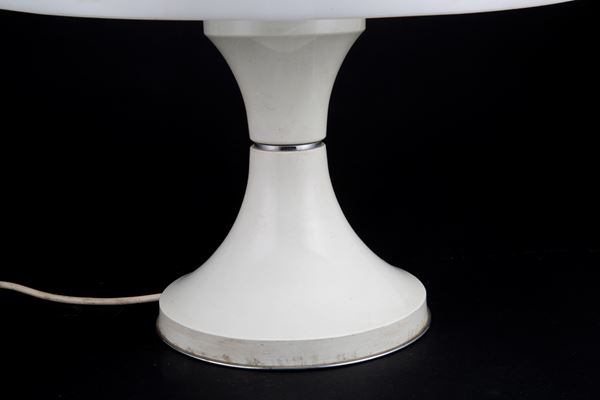 Table lamp in white lacquered aluminium, glass and plexiglass. Production VALENTI & Co. Milan. With manufacturer's label inside the lampshade. 60s-70s.
