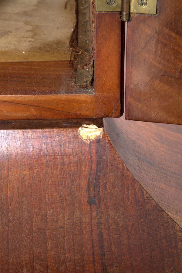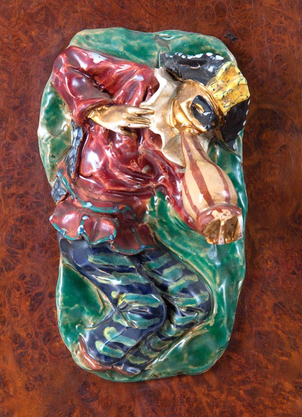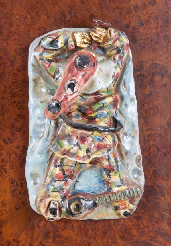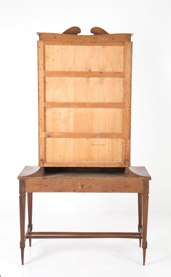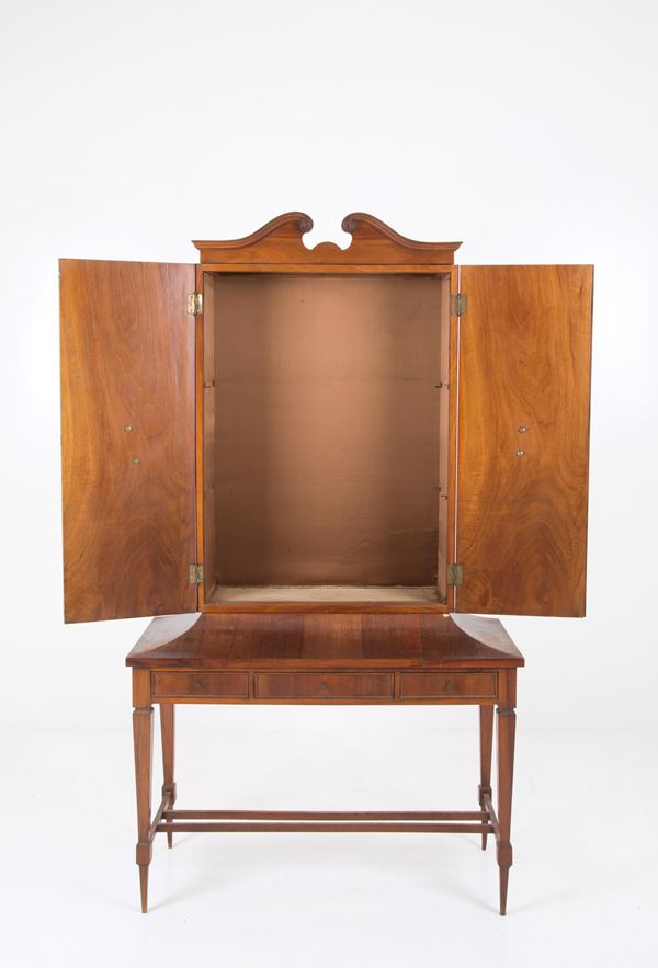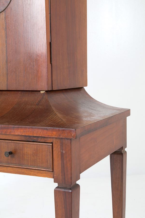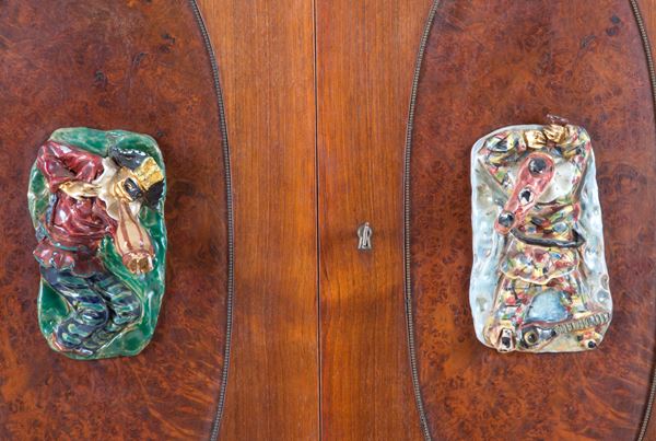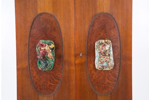 Small trumeau veneered in walnut wood and oval birch inserts in Gio Ponti style, tapered legs and with two ceramic sculptures of SAN POLO made by OTELLO ROSA as handles. Production MOBILIFICIO CANALE. 1956. Slight defects and missing internal shelves.