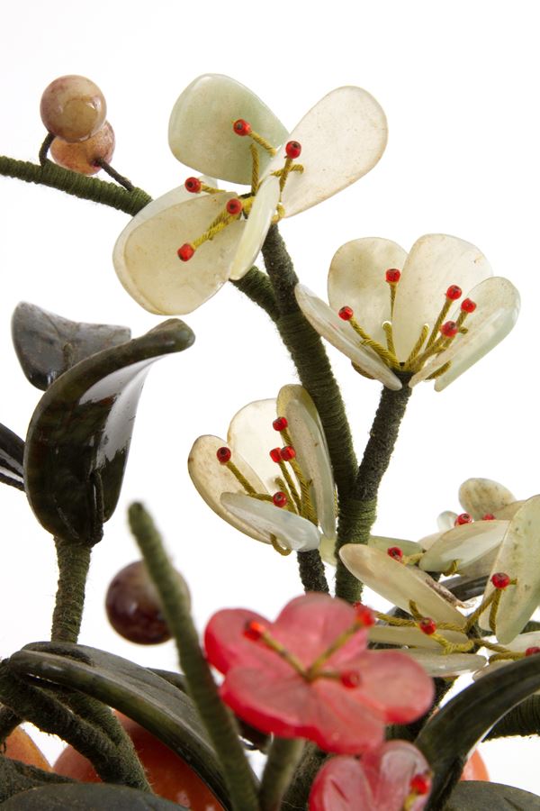 Basket of flowers and fruit in semi-precious stones on a lacquered wooden base. China. Defects.