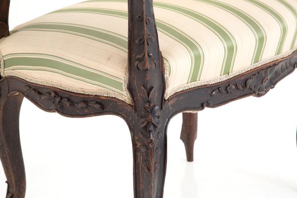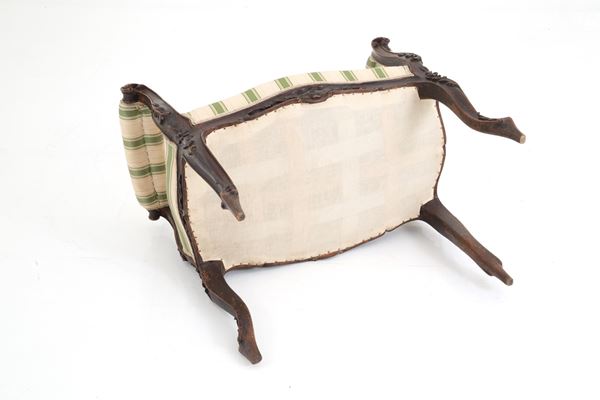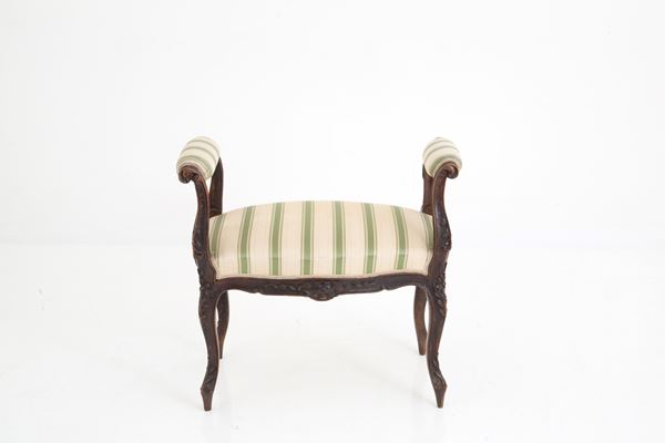 Carved wooden bench with padded seat and armrests. Late 19th century.