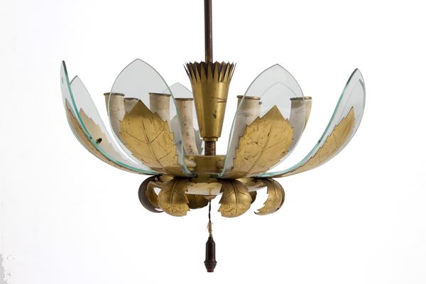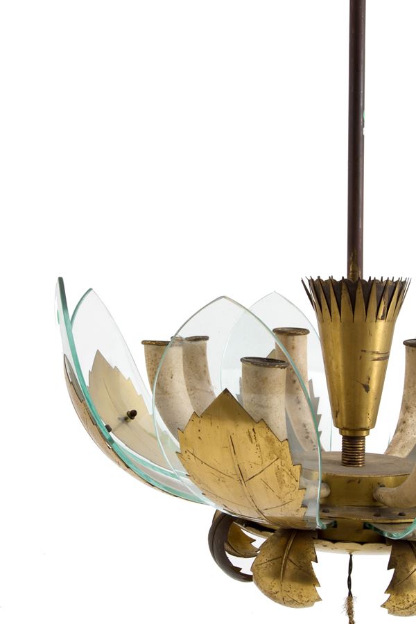 Chandelier with golden metal structure and leaves and glass diffusers. Italian manufacturing. 60's. Defects and breakage of a glass.