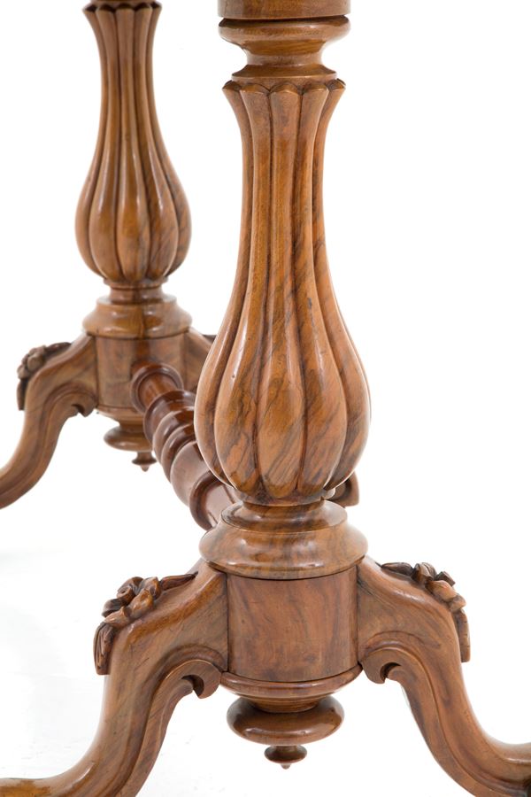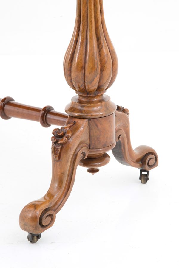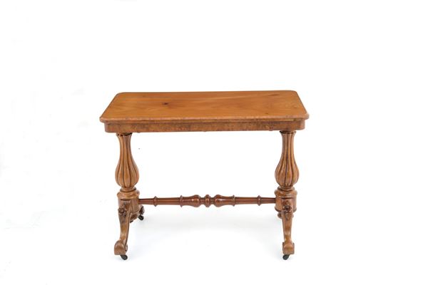 Coffee table with legs in turned and grooved walnut wood and top veneered in walnut root. England. 19th century.