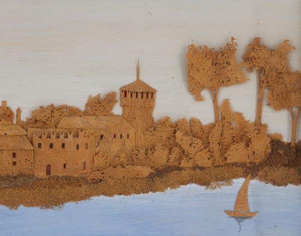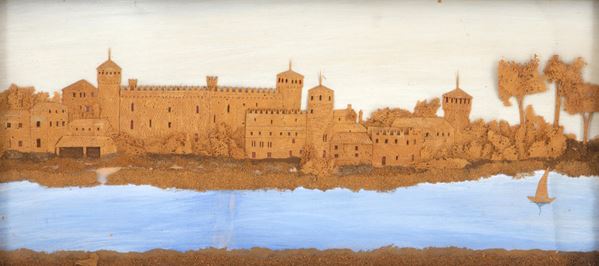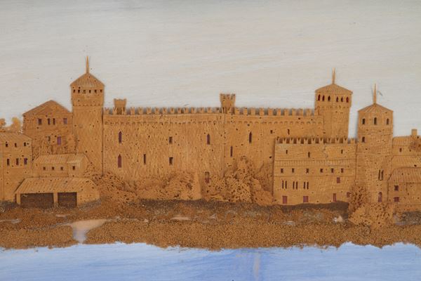 Cork diorama depicting "CASTLE OF VALENTINO". In frame.