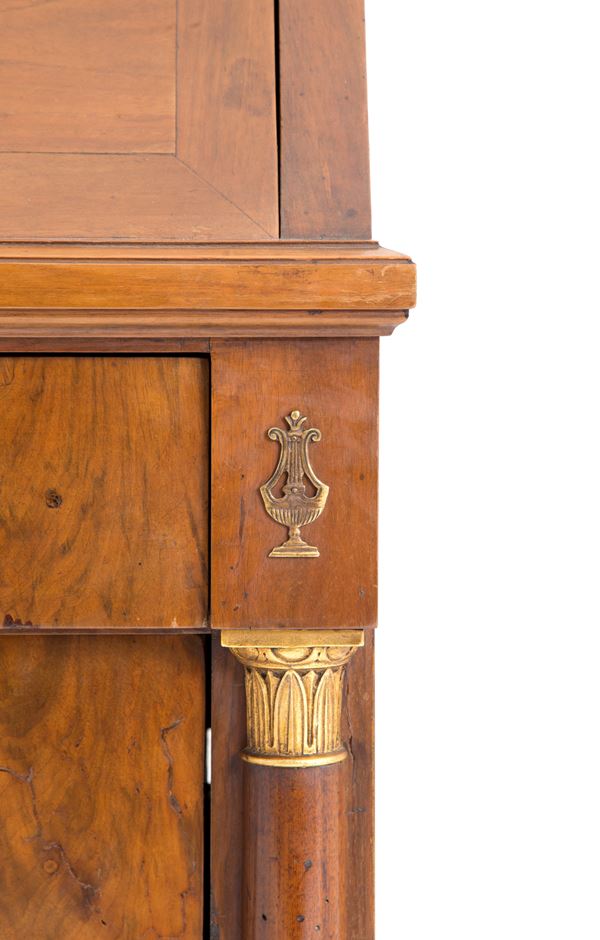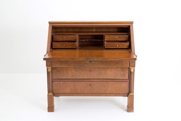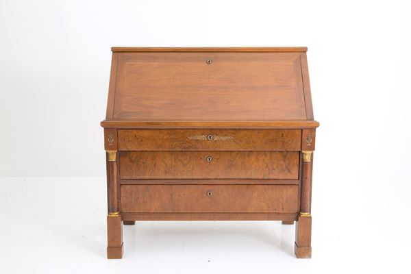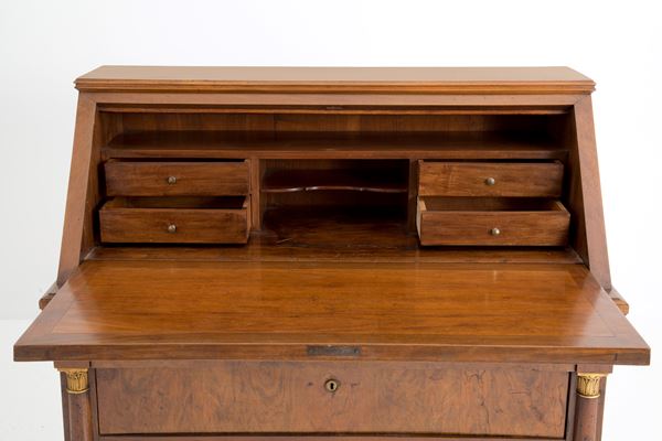 Walnut veneered flap cabinet with three drawers and slider. Empire period.