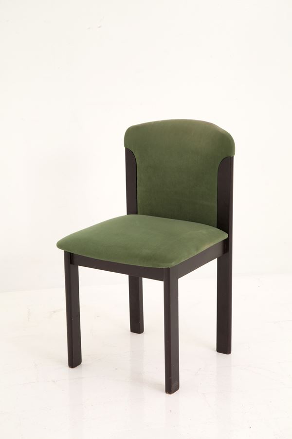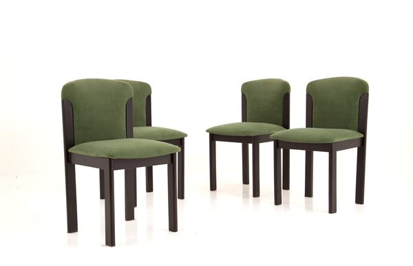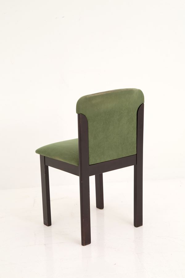 Four chairs in brown lacquered wood and green fabric. 60's. Defects.