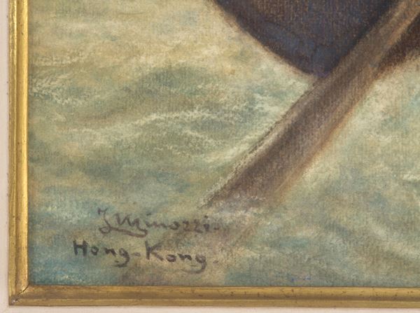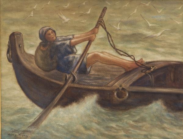 Watercolor on cardboard entitled "CHINESE ROWER HONG KONG". Signed lower left. With cartouches of the Duomo Gallery and Pesaro Milan Gallery on the back. In frame.