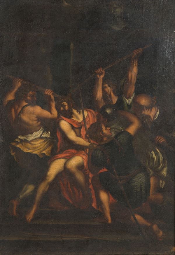 Oil painting on canvas depicting "CORONATION OF THORNS". From Tiziano. 17th century. In a golden pastille frame. Already relined and reframed.